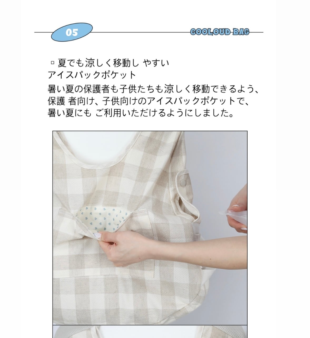 肩の痛みを最小限に抑えるよう、両肩に重さを分散してしっかりと握ってくれ、保護者様の体も考える快適な移動バッグに仕上がりました。
