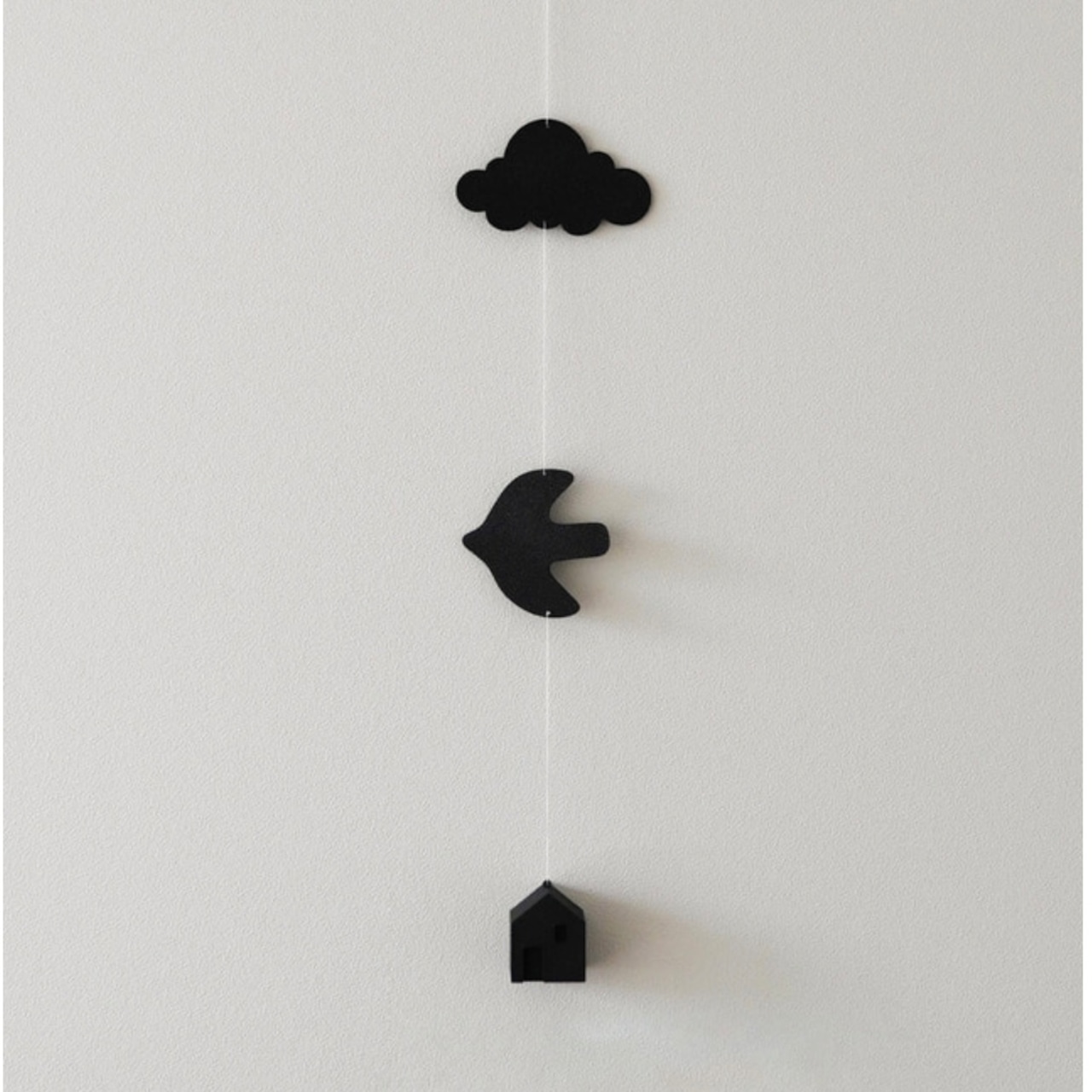 雲、鳥、家の形で構成されたモビールです。