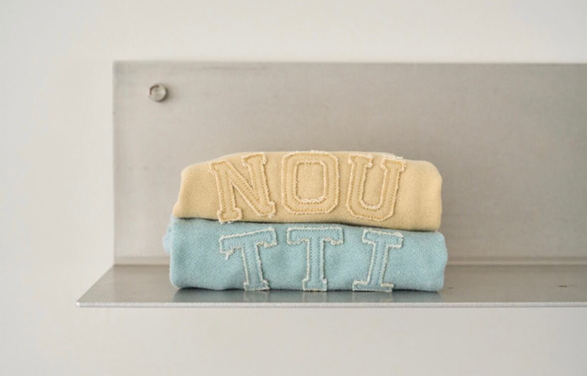 ネックラインの内側には、ヌービーのロゴプリントテープですっきり仕上げました。