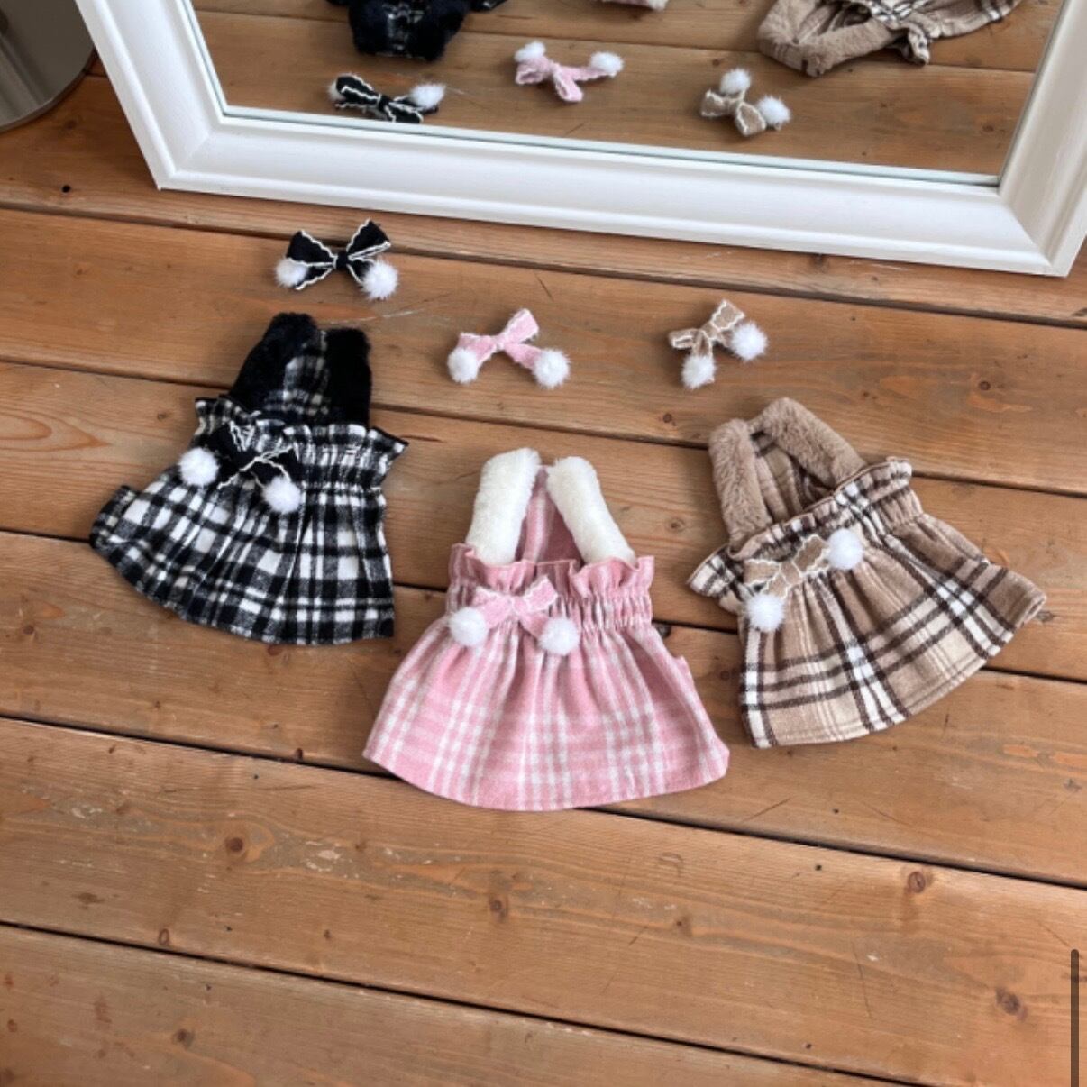 チェックパターンのワンピースにエコファーの肩ひもを加えエレガントでラブリーなムードの完成