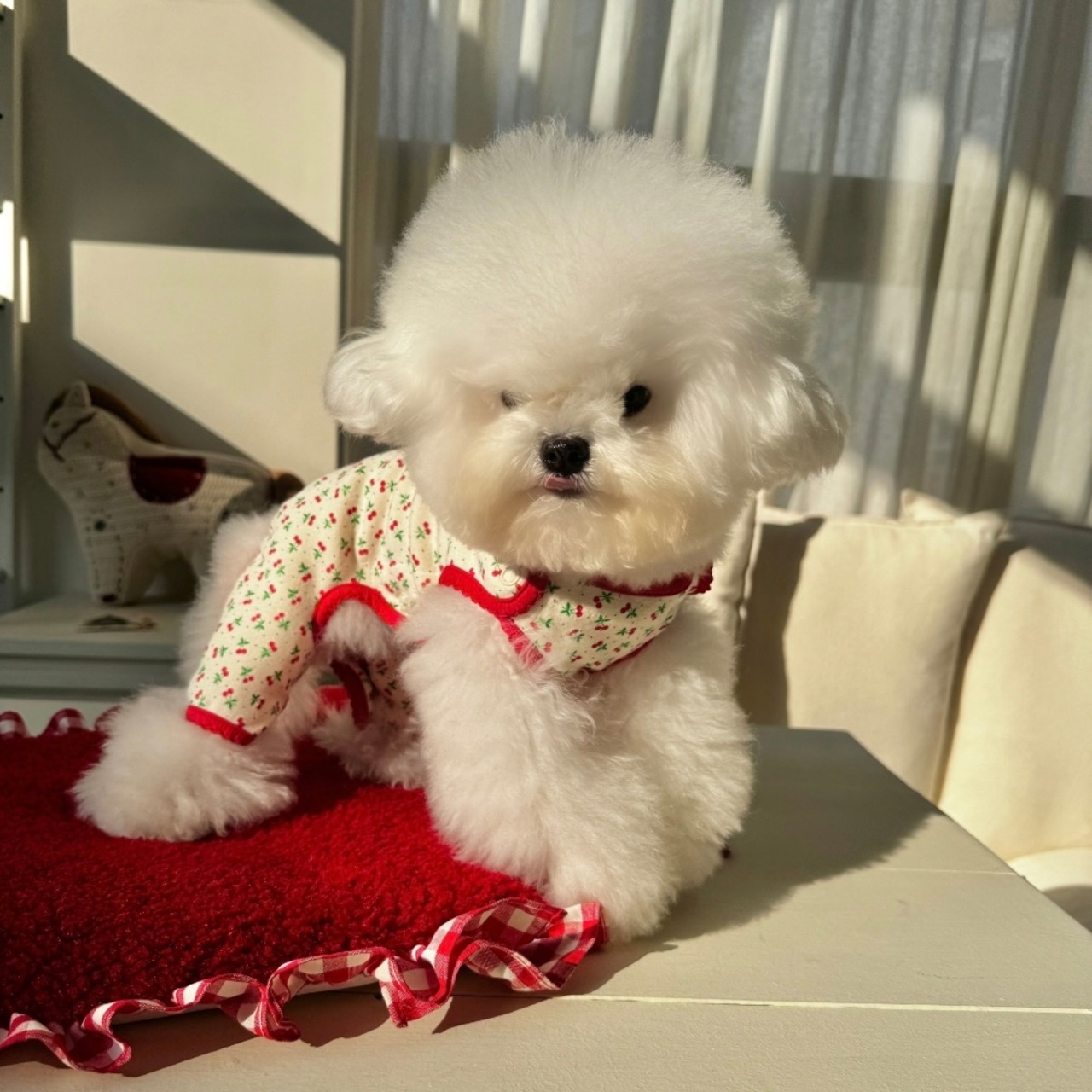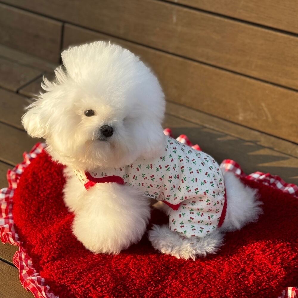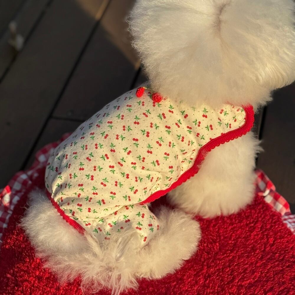 背中に可愛いチェリーニットでポイント!この製品はスナップボタンで四方が全部開くオールインワンです。