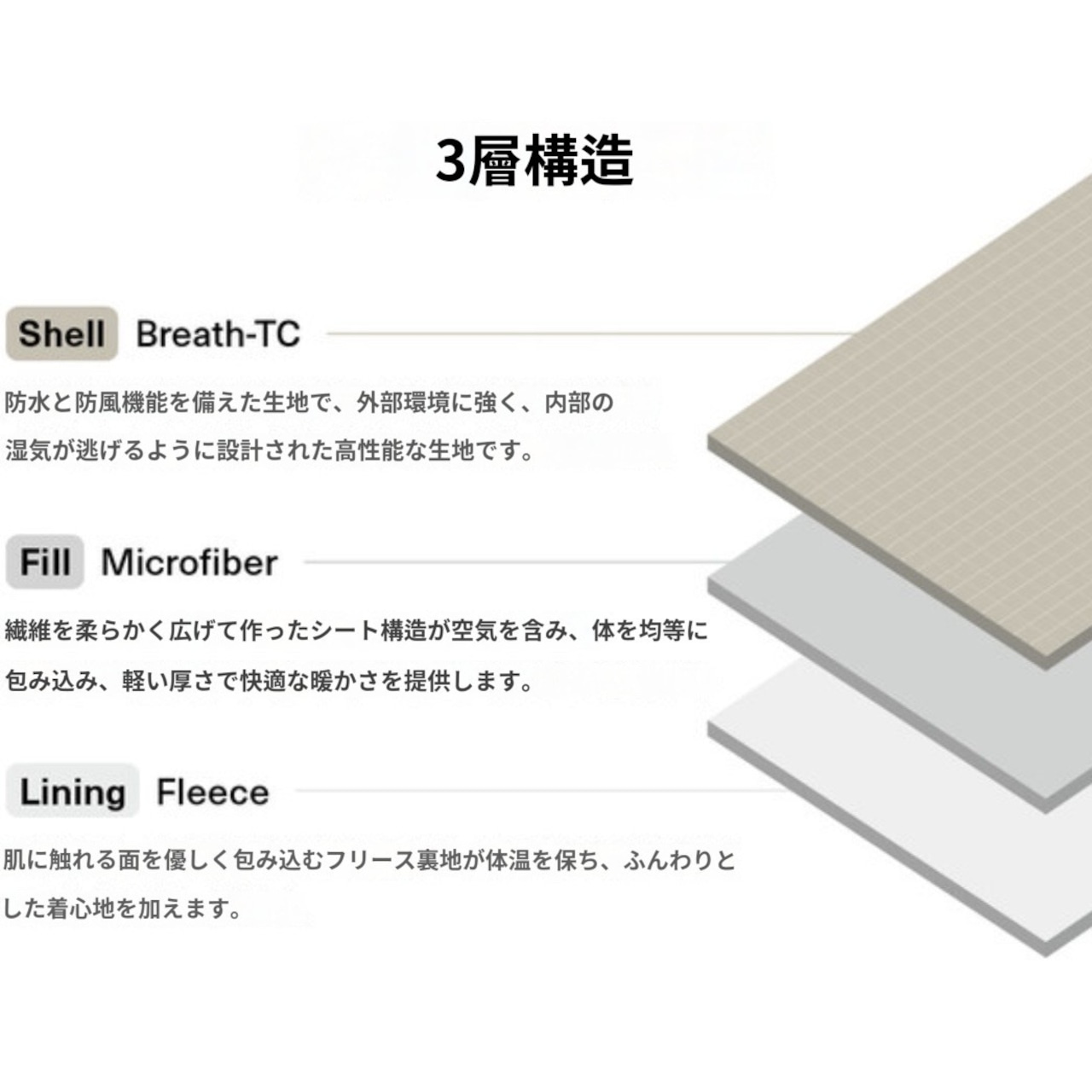 軽い着用感とバランスの取れた暖かさのための3重構造のダウンコートです。