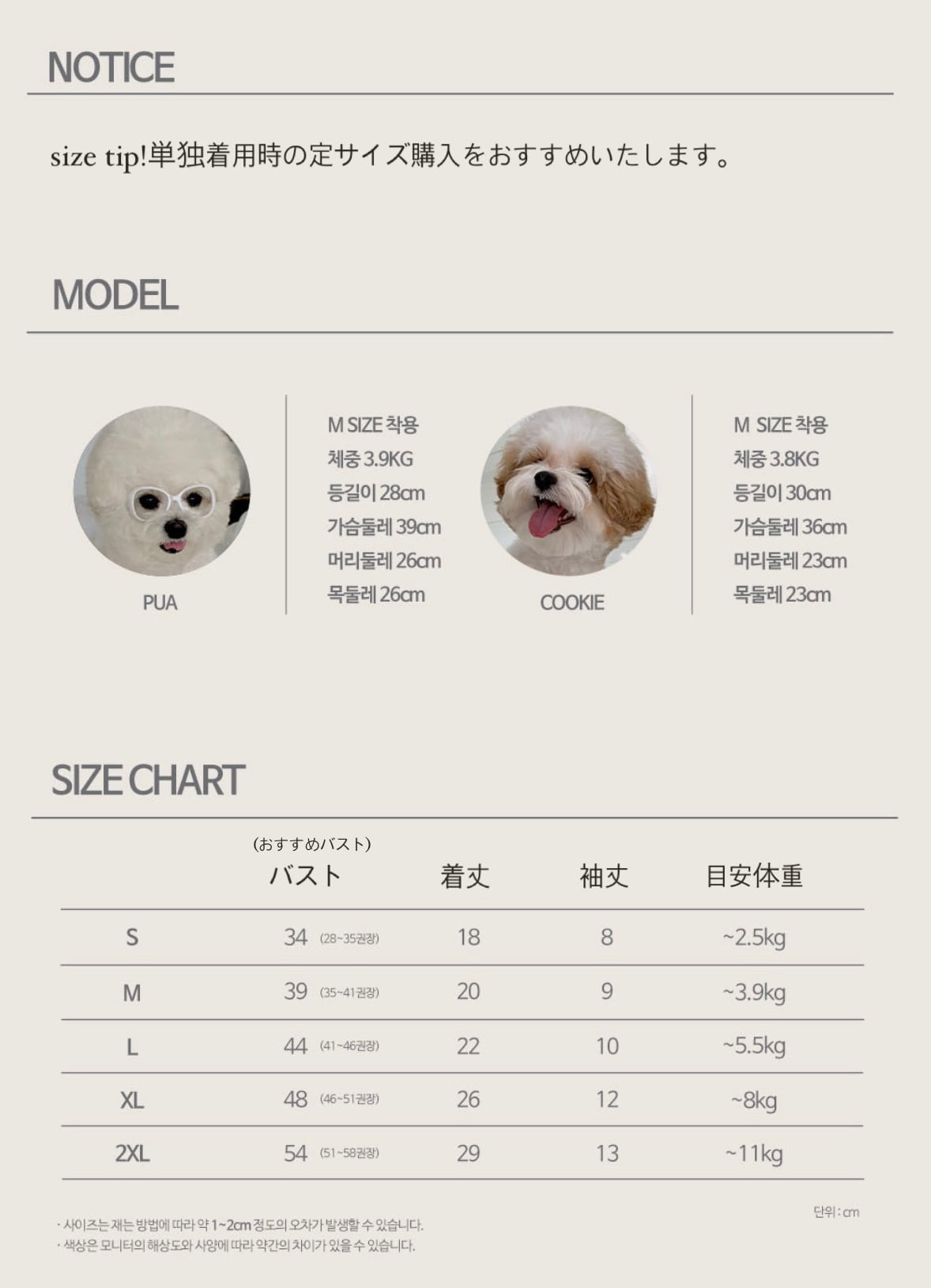 3.8kg/バスト36cm/背丈38cmMサイズ着用