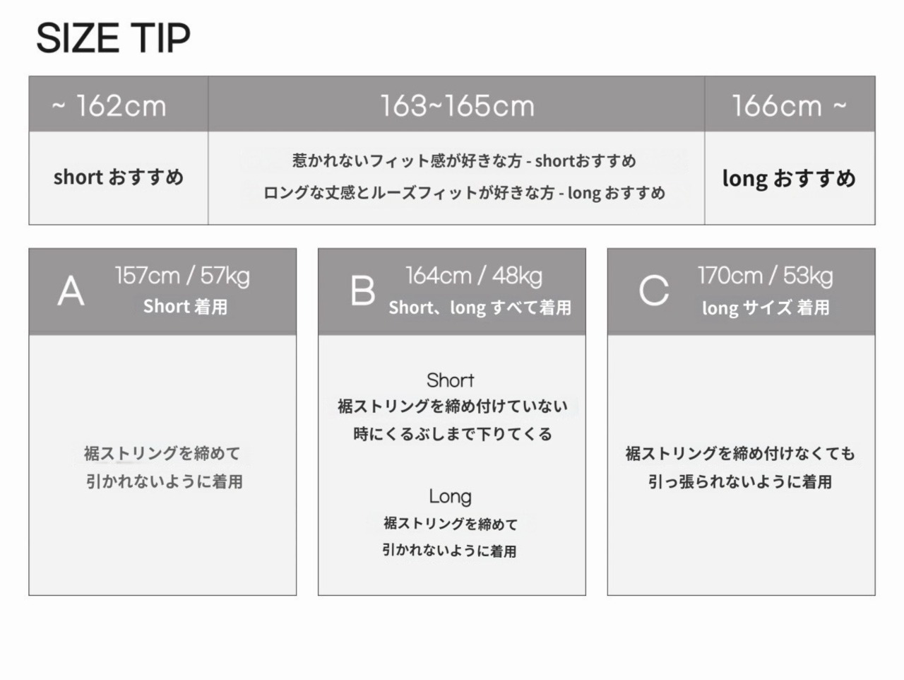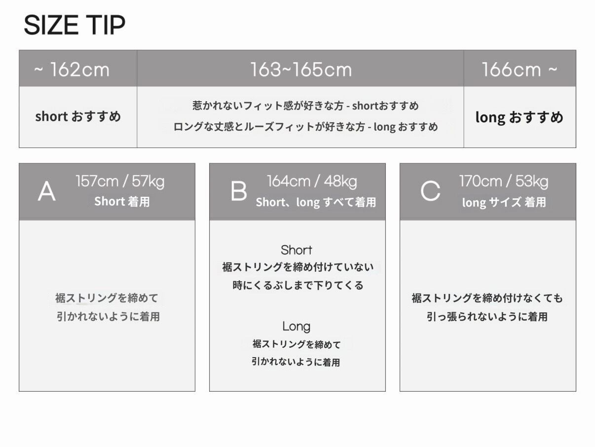 丈によってshort/long 2つのサイズの中から選択してください
