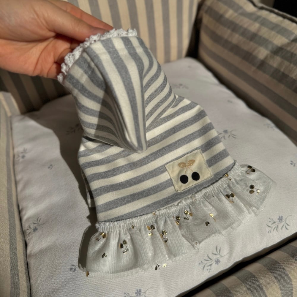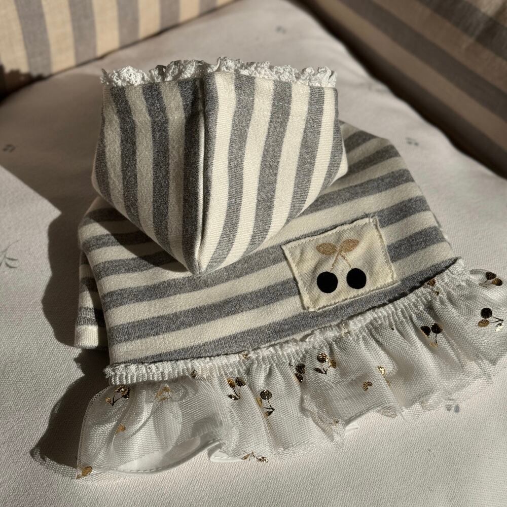 フーディーデザインでカジュアルなムードを演出し、裾にはチェリーパターンがさりげなく入ったメッシュフリルをレイヤードしてラブリーなディテールを逃しませんでした。