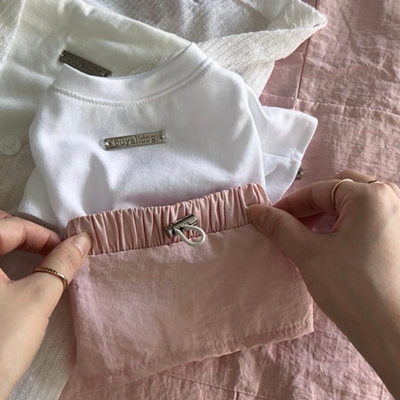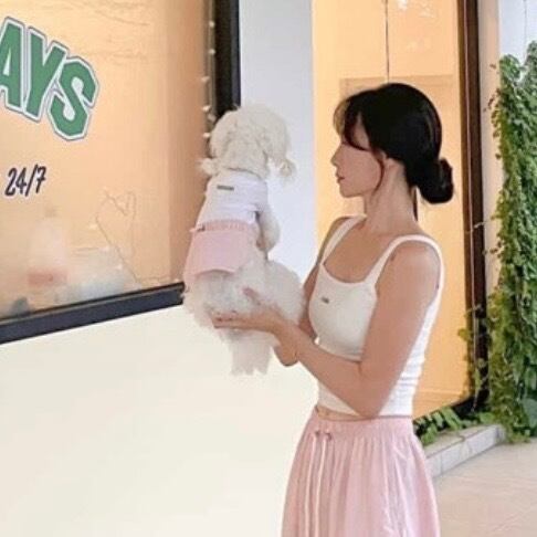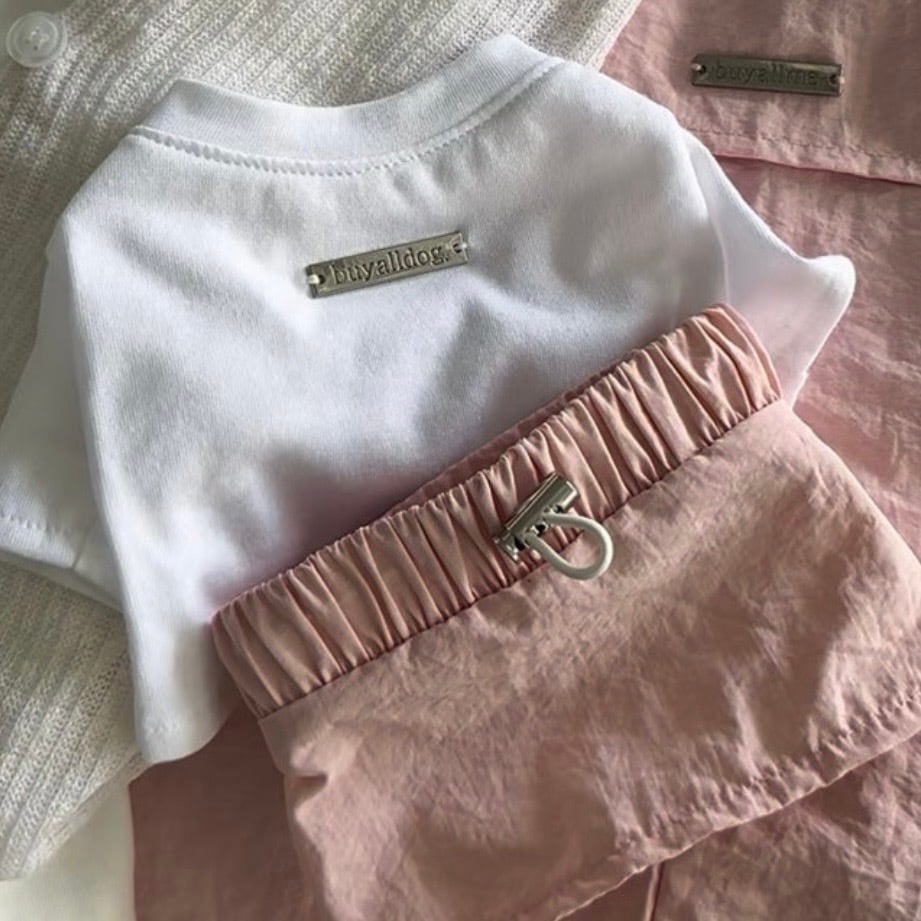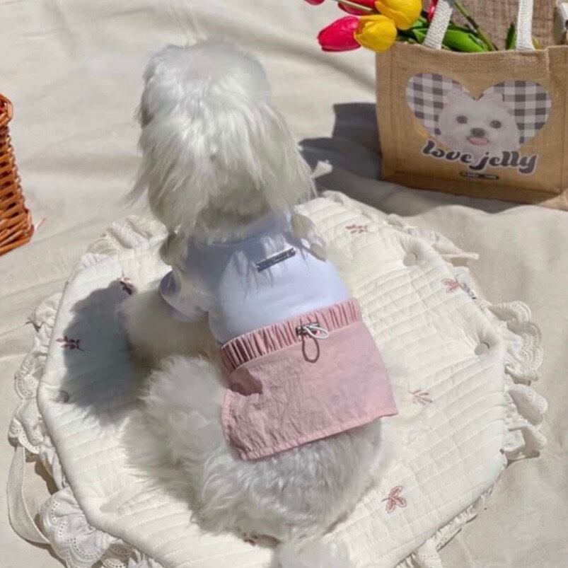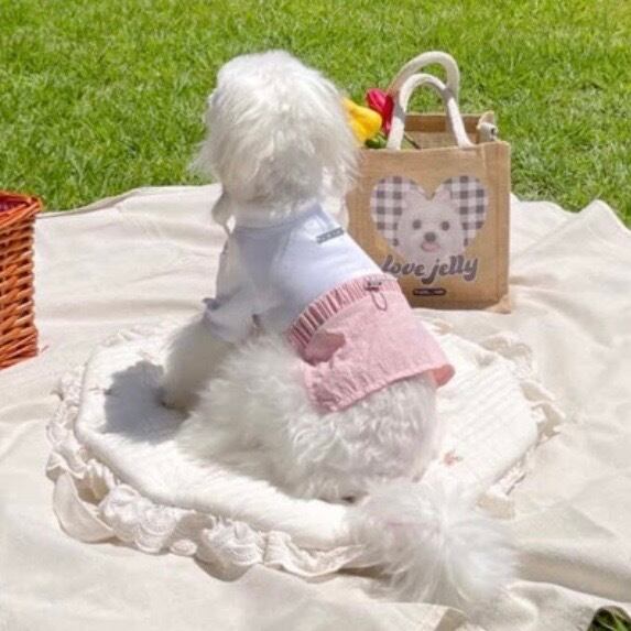 愛犬はベーシックなTシャツとスカートでコーディネート。