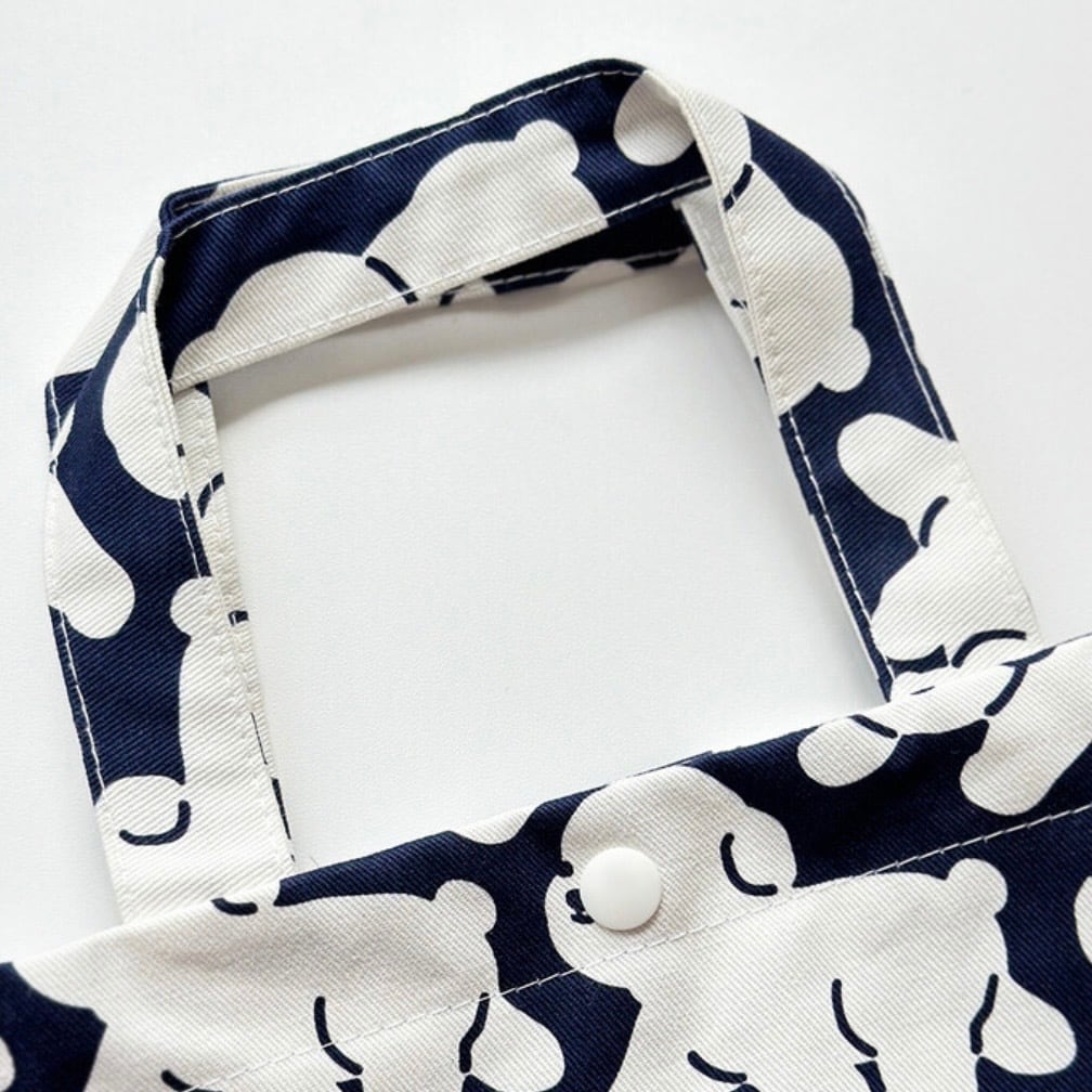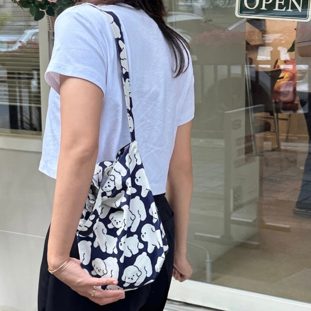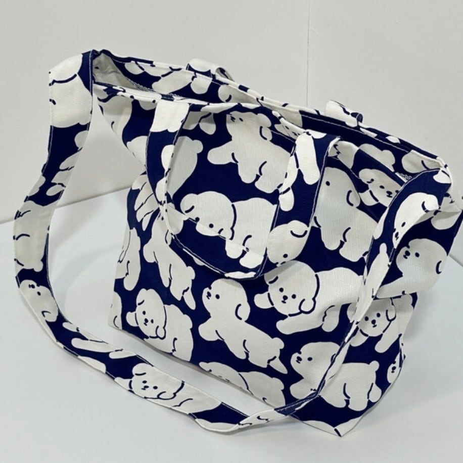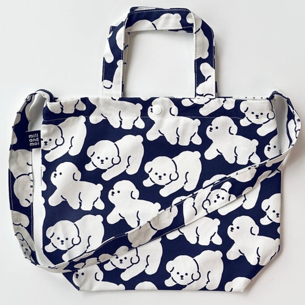ネイビーに白いビションキャラクターパターンでシンプルなので、どこにでもよく合います。