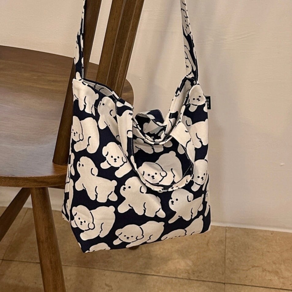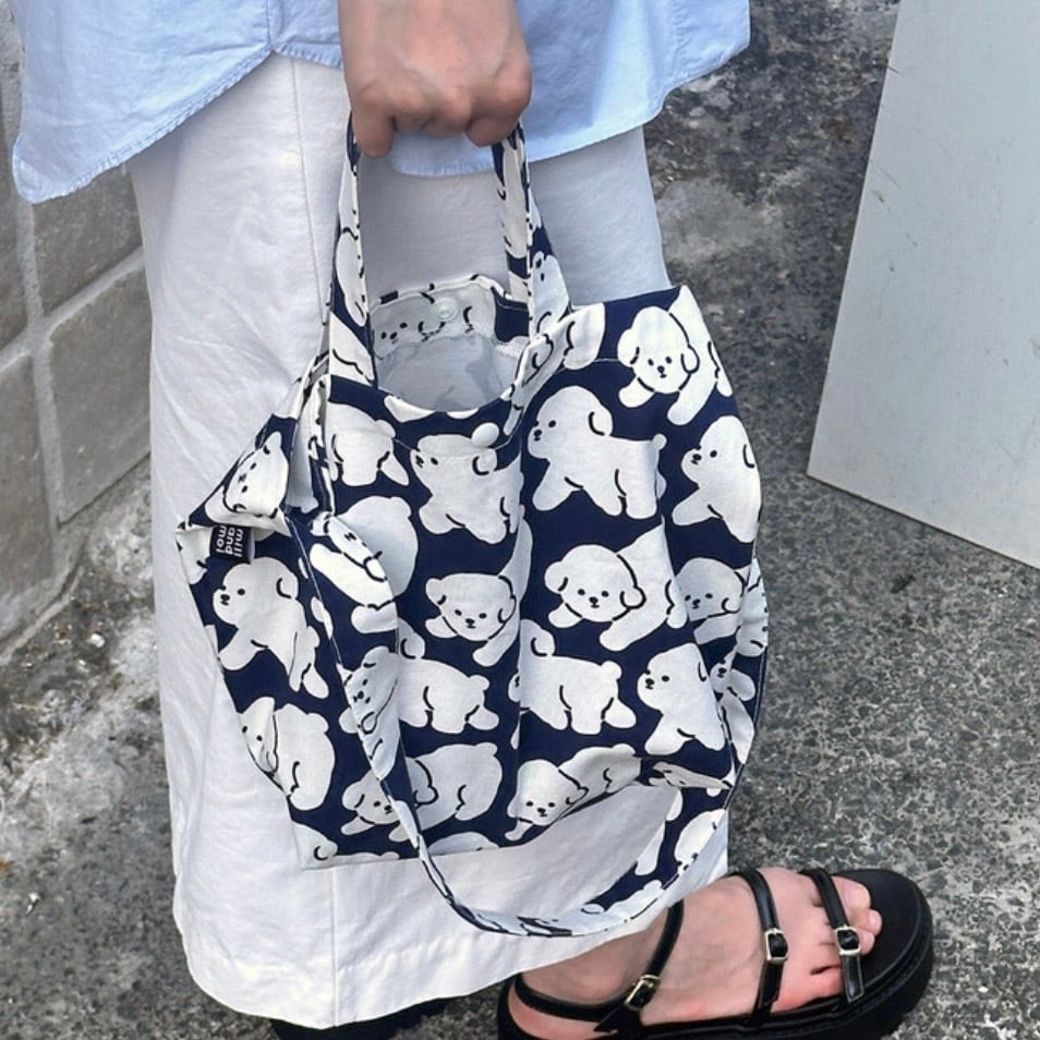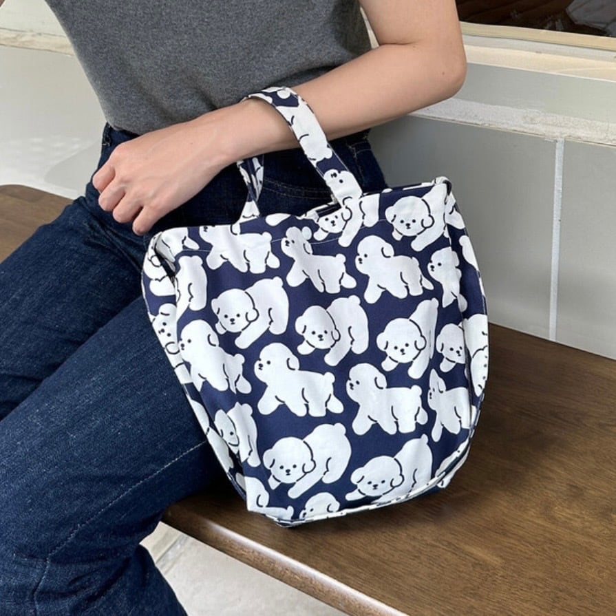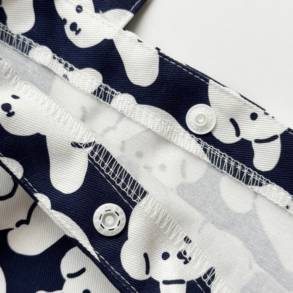 ネイビーに白いビションキャラクターパターンでシンプルなので、どこにでもよく合います。