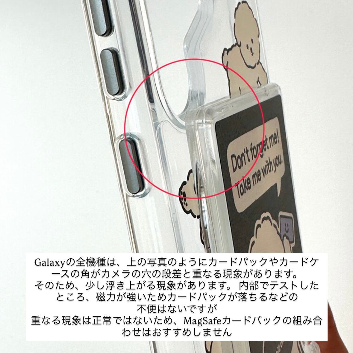 - Galaxy機種はカードパックを装着するとカメラの穴の上に角の一部が重なり、カード財布の組み合わせはおすすめしません。