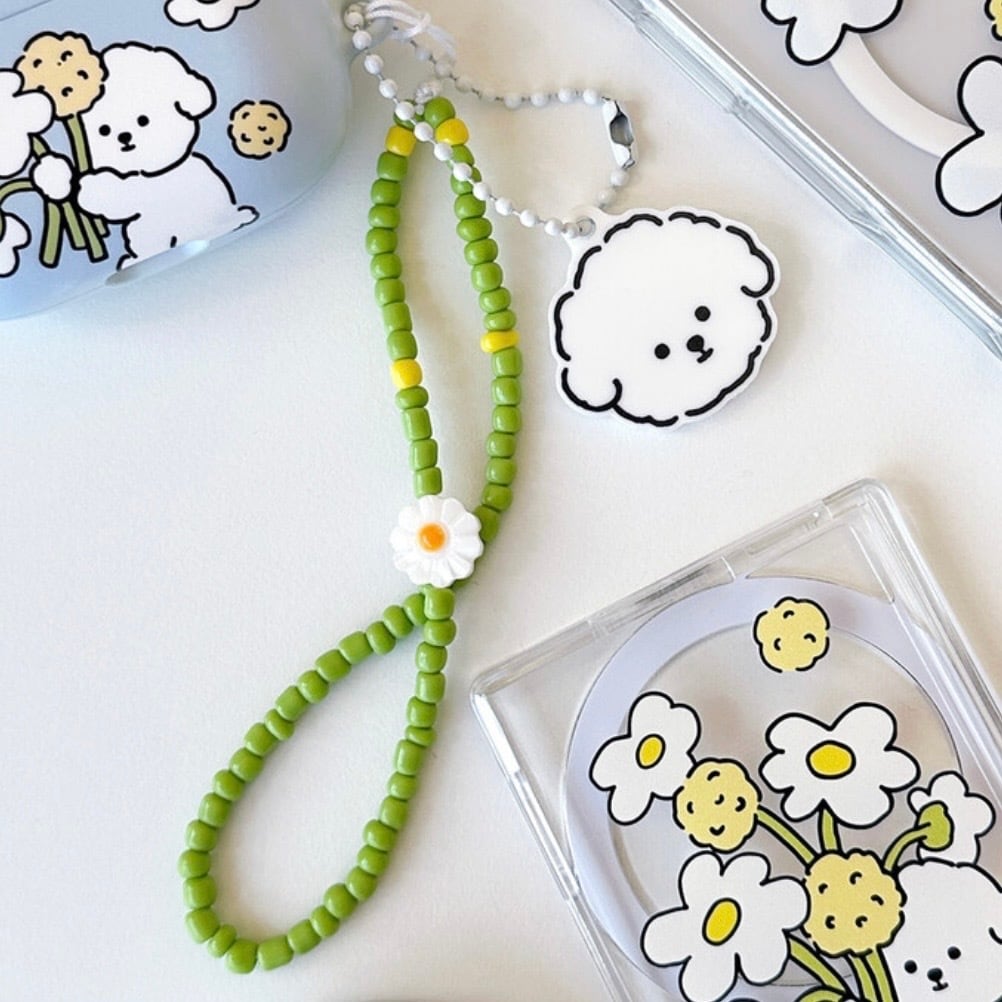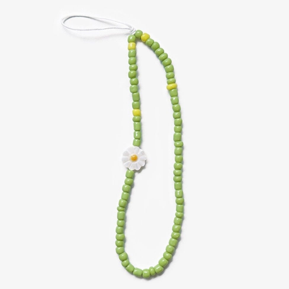 小さなライム(黄緑)色にデイジーの花がアクセントとなった、明るくさわやかな印象のビーズストラップです。