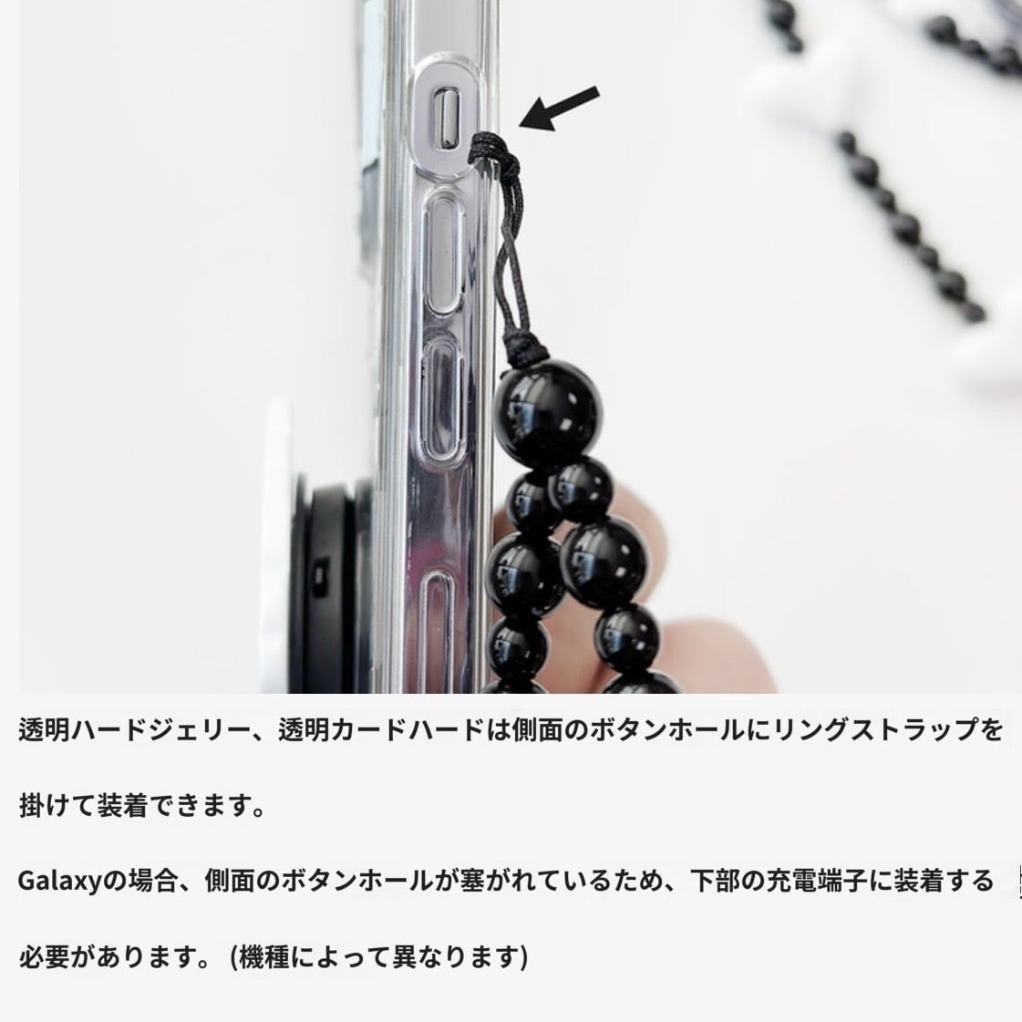 以下の機種はケース側面の専用穴にビーズストラップを装着できます。