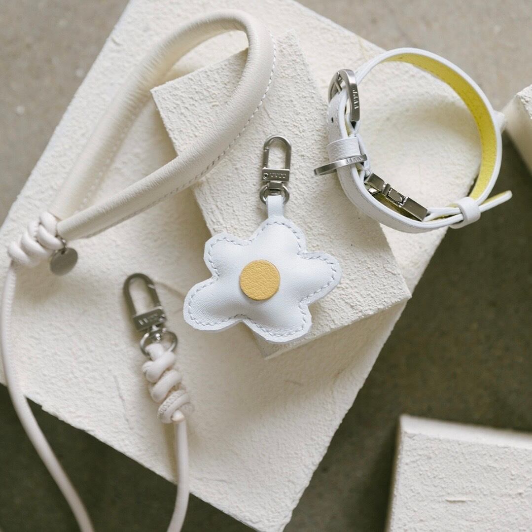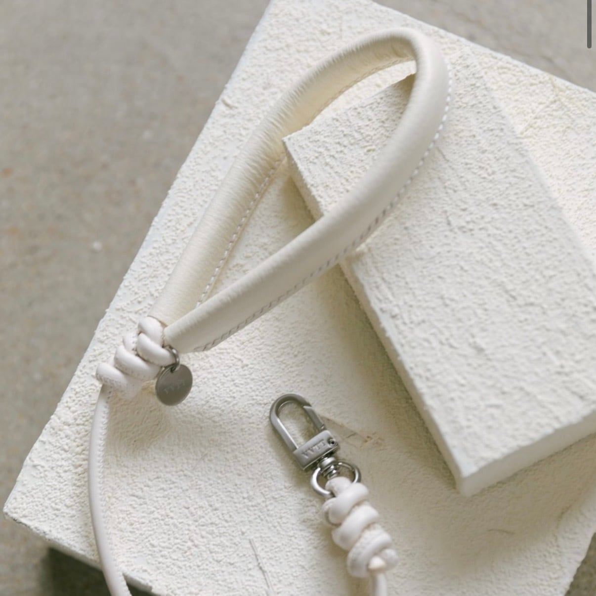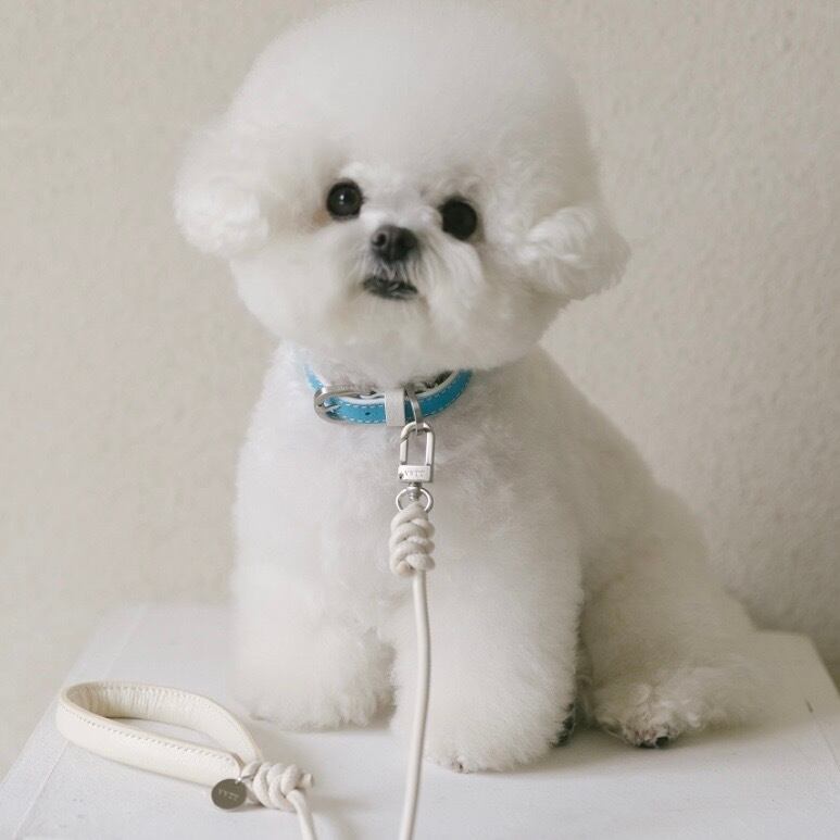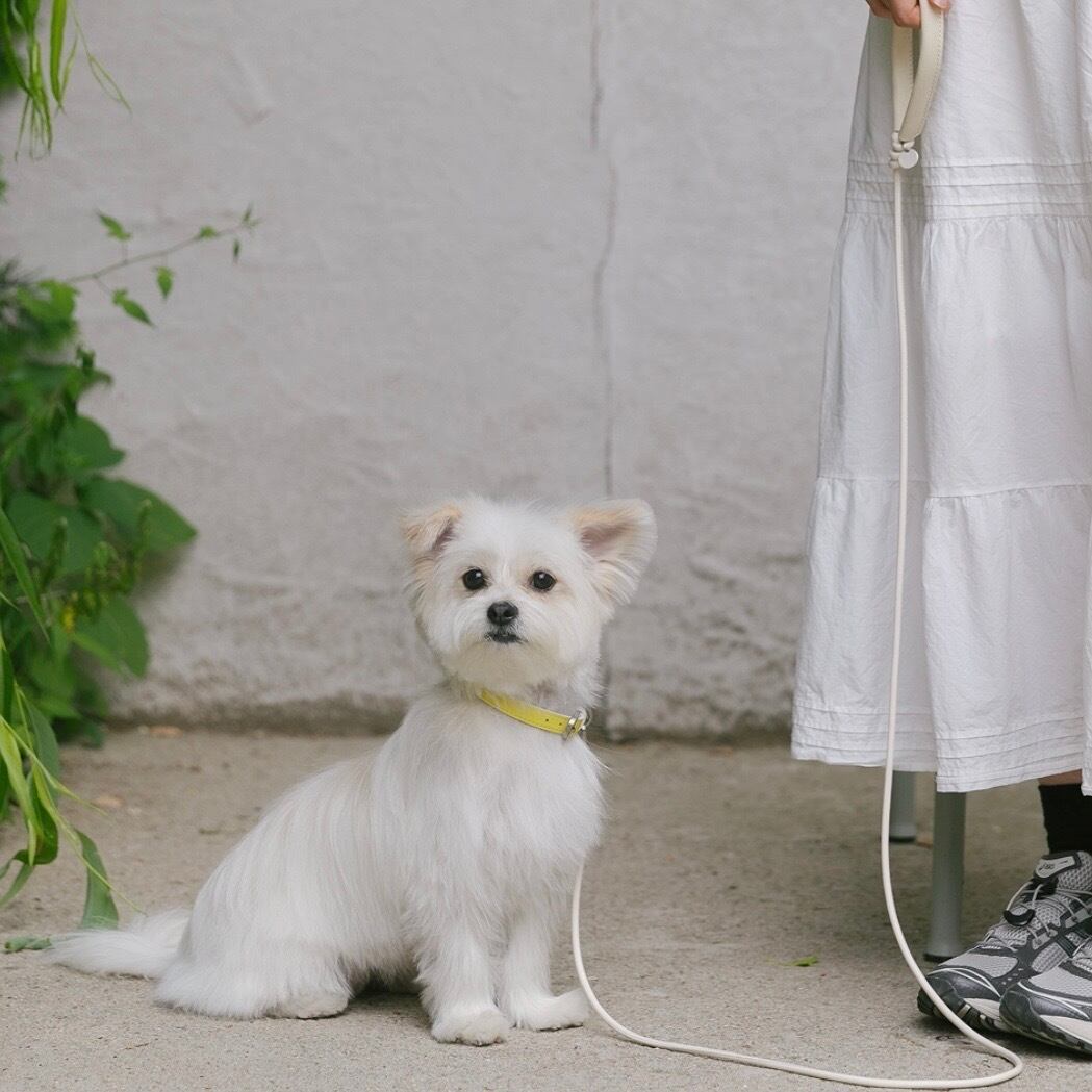 柔らかく弾力のあるレザーコードにフランス産クリスプレザーのハンドルを加え、さらに弾むような手触りの快適な、クリームアイボリー色の Crème Leash。