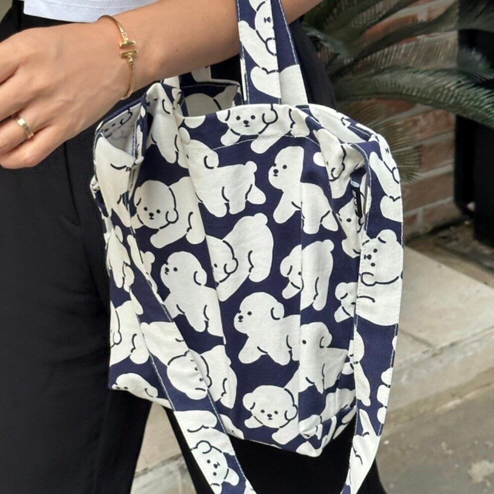 ネイビーに白いビションキャラクターパターンでシンプルなので、どこにでもよく合います。