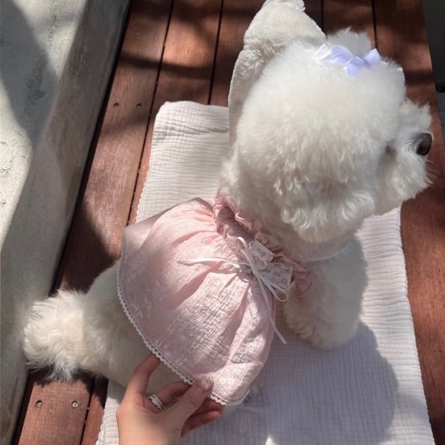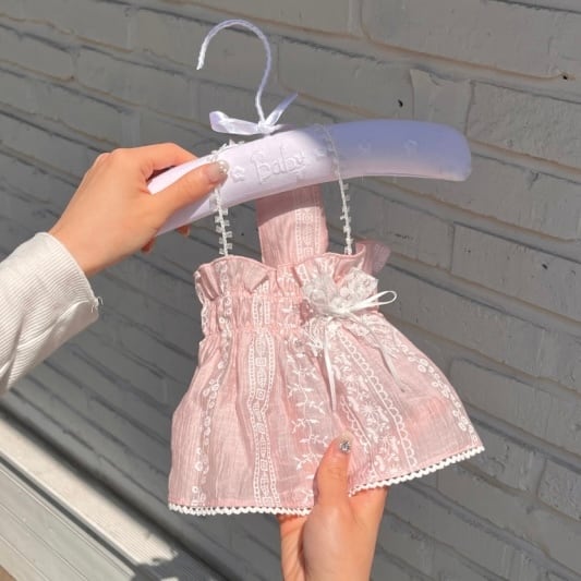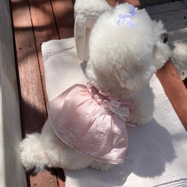 淡いピンクのリネンムード素材に、控えめな刺繍が加わり、特別でありながら柔らかな雰囲気を感じられます