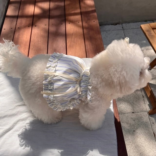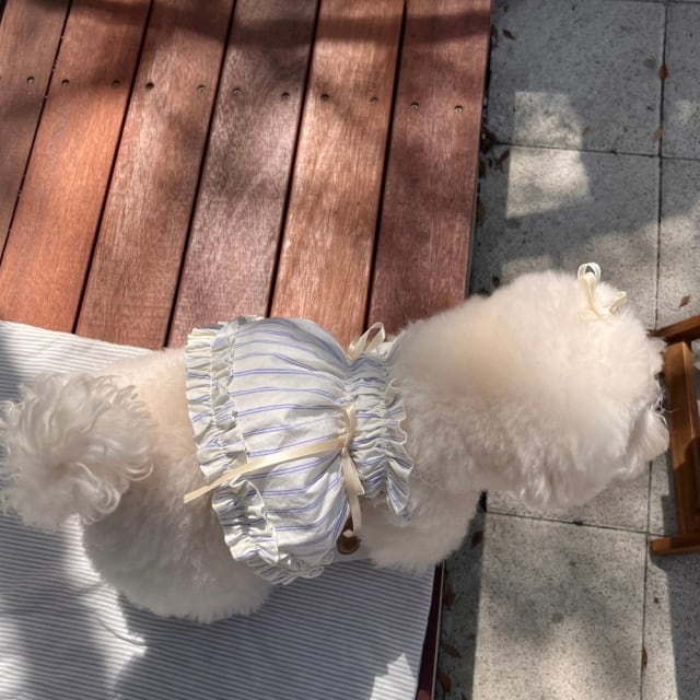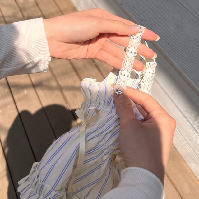 柔らかな色合いのイエローストライプ柄で明るくさわやかな印象を与え、レースのショルダーストラップでロマンチックな雰囲気をプラスしました