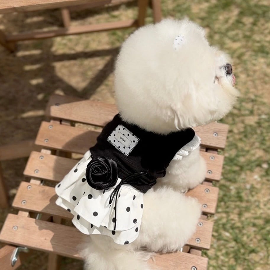 豊かに広がる2段フリルシルエットとクラシックなドットパターンでたった1着だけでも十分なポイント