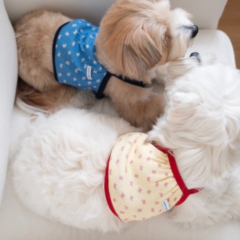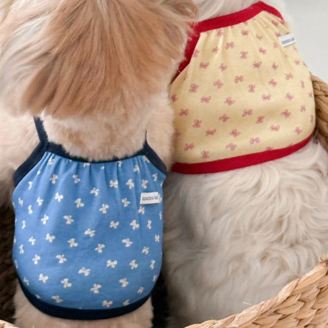 穏やかなリボン柄にカラーアクセントを加えて可愛らしさをプラスしたクロップドナシトップ