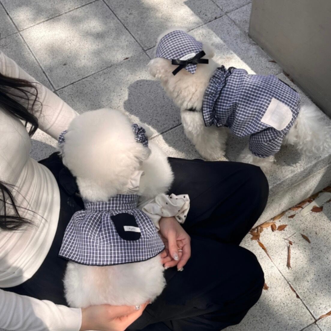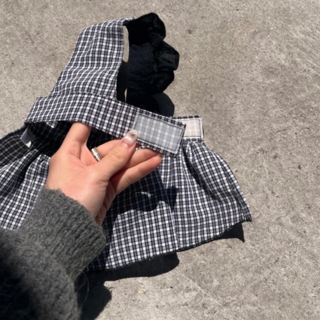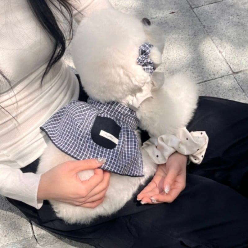 クラシックな雰囲気のブラック&ホワイトチェックワンピース&ロンパースチェック柄のバンダナとシュシュを加えて、すっきりとした可愛らしいスタイリングを完成させました。