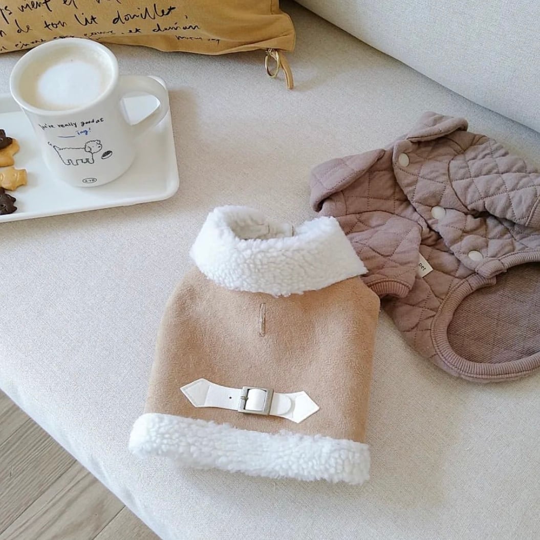 オールインワンの上にハーネスを羽織ってムートンベストを着て