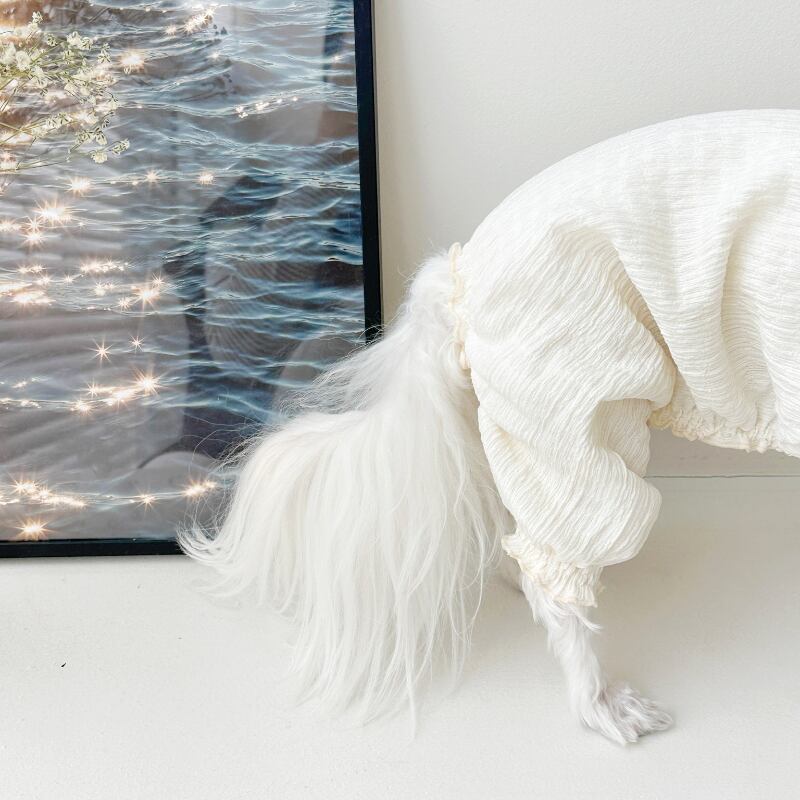 ネックラインと裾部分はスモーキングディテールでポイントを与え、