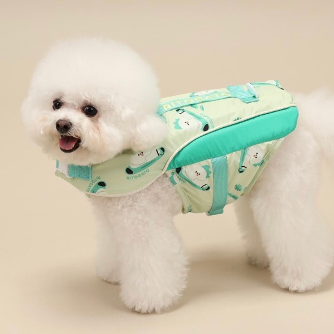 ライフジャケットの登板にペットをコントロールできるようにハンドル があり、突発状況や水泳姿勢の矯正に役立ちます。
