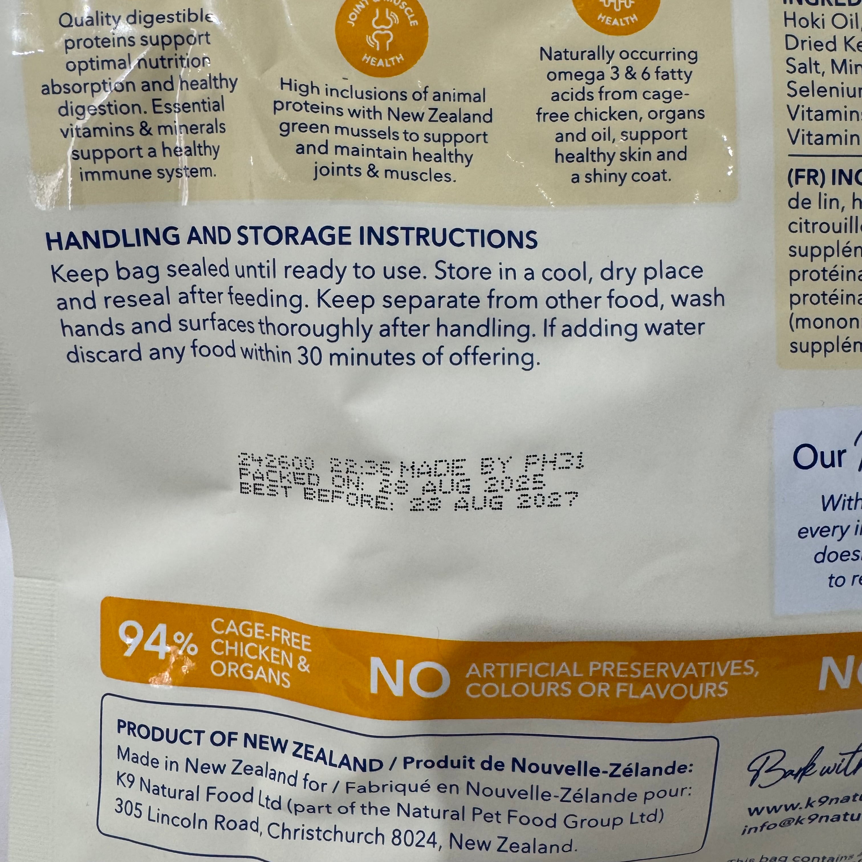 鶏肉、肝臓(鶏)、フラックスシードフレーク、ホキ(白身魚)オイル、にんじん、ニュージーランド緑イ貝、かぼちゃ、ブロッコリー、乾燥昆布、リン酸二カリウム、ビタミンE、塩化ナトリウム、ミネラル類(プロティネイト亜鉛、プロティネイト鉄、酸化マグネシウム、セレン酵母、プロティネイト銅、プロティネイトマンガン)、ビタミン類(ビタミンB1、ベータカロチン、葉酸、ビタミンD3)