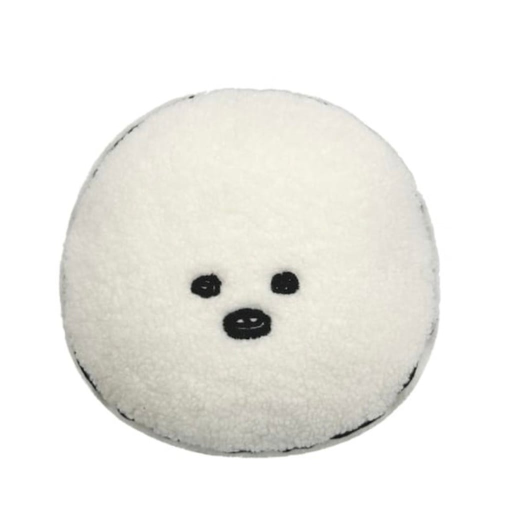 モングのクッションをご紹介します。 耳なしまんまるは基本型で、「耳付き」は別ページでご購入できます。 裏面には大きめのポケットがあり、外出時にはお子様の軽食や持ち物を入れることができ、冬場はカイロを入れるとより暖かくお使いいただけます。